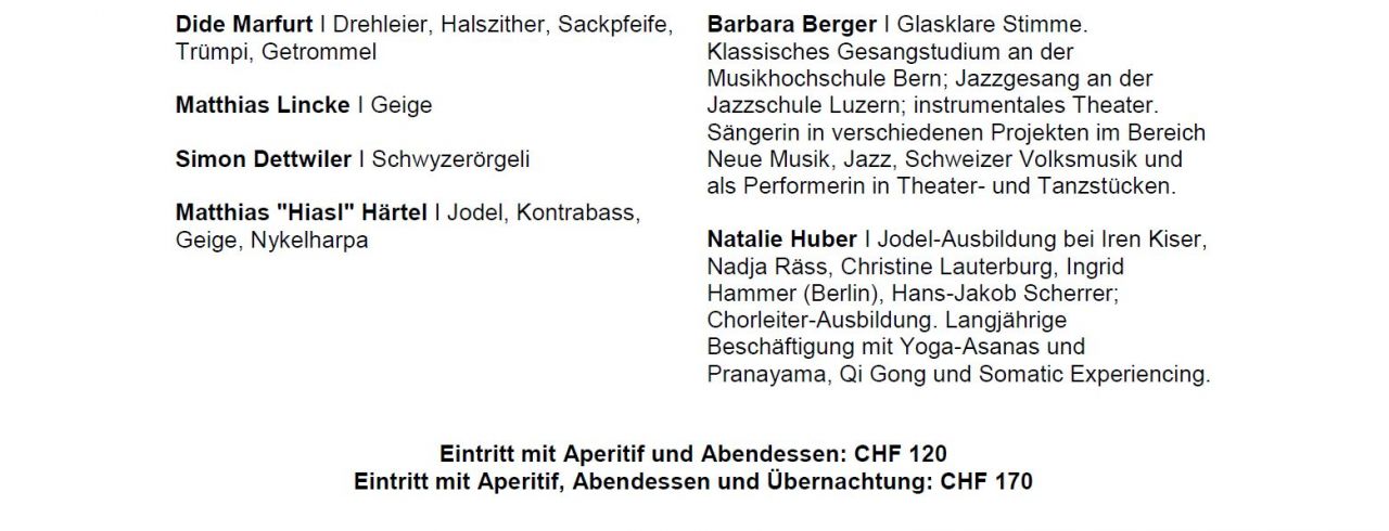 Music betwenn tradiotional local sounds with elements of Jazz and improvisation. Together with Isa Wiss, one of the most interessting Singers in Switerzland, many playfull and virtuous possabilaties are created in their music.
